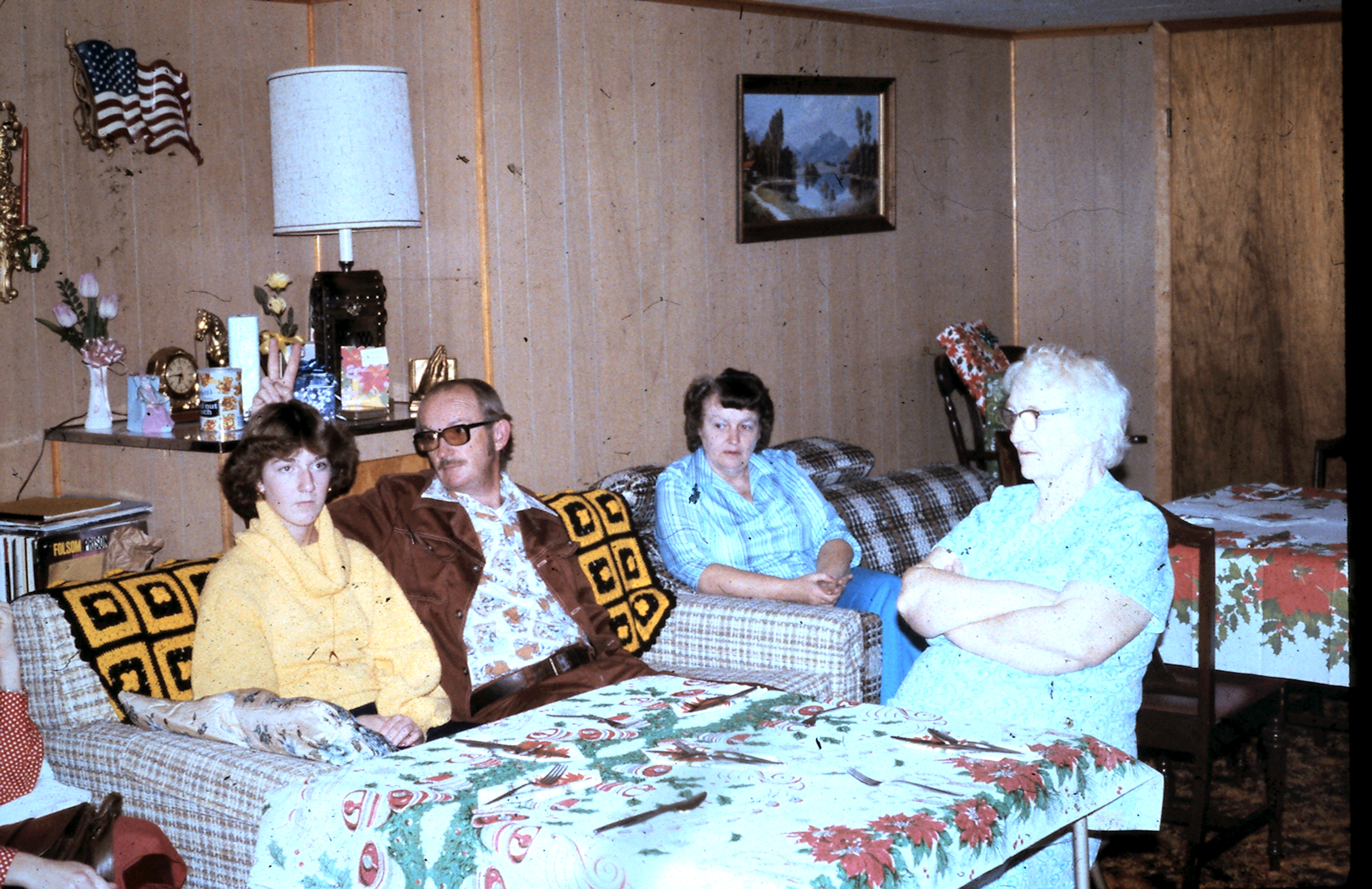 My Grandparents’ basement. From Left to right: My sister, Marie; Dad, Lester; Aunt Shirley; Grandma Kitchen.
