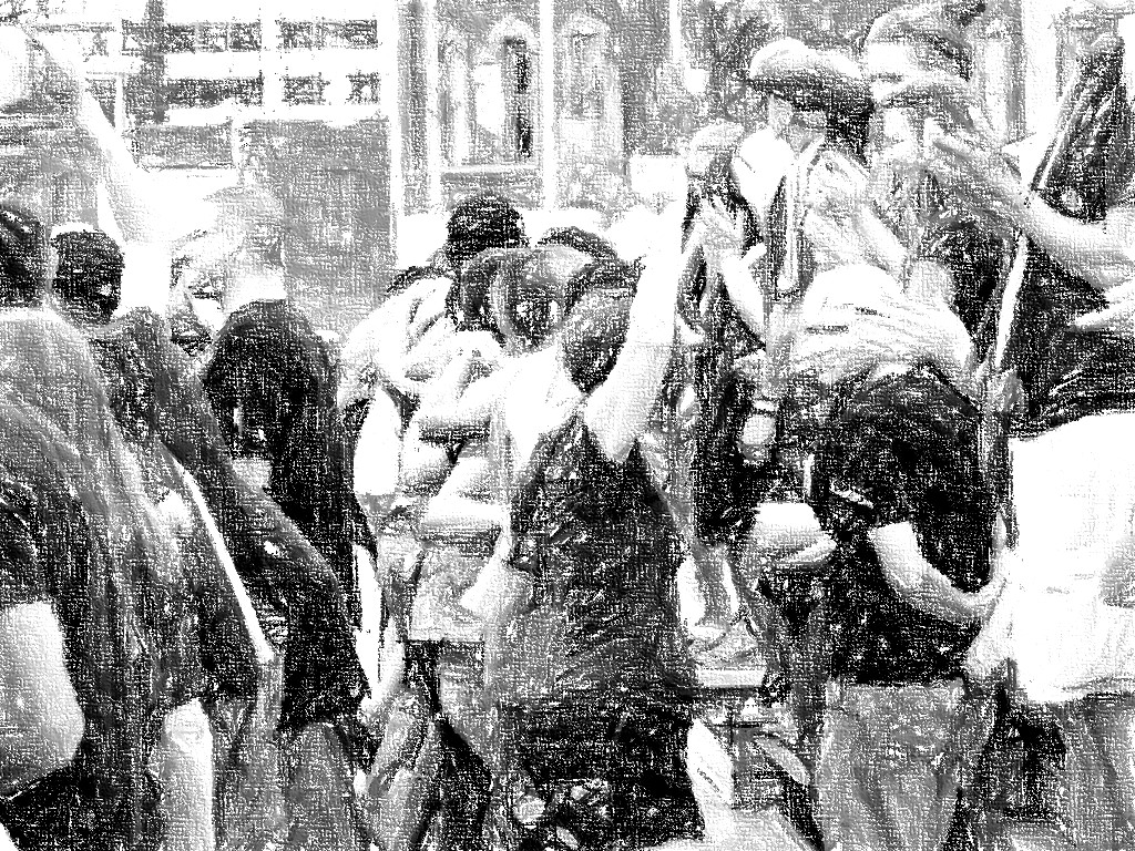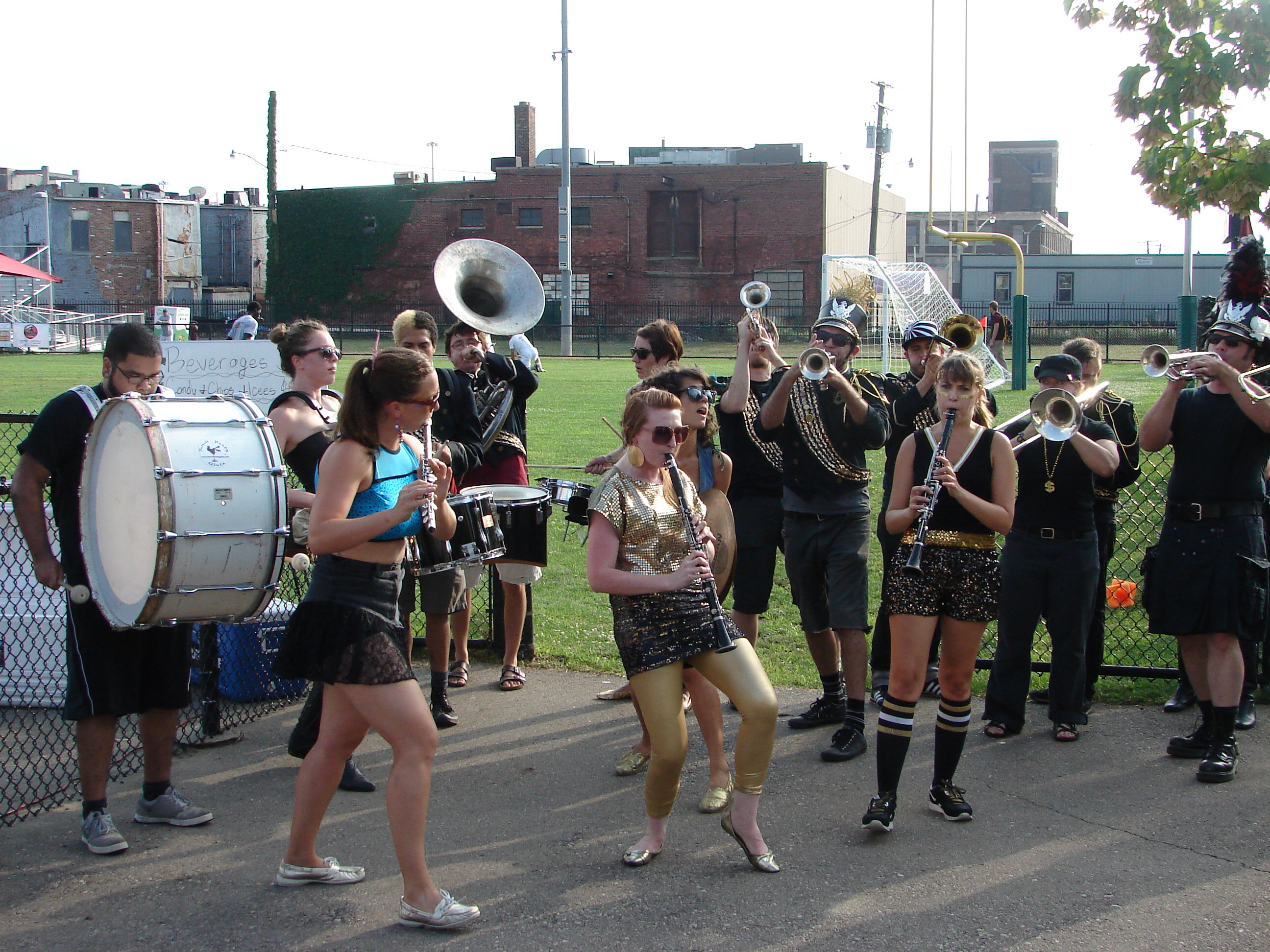 Other than that I didn’t mingle. Bars aren’t my scene, and those gathered seemed to be all grouped together with friends they had met during the season, engaging in their own conversations. The call went out, and we all went down to the parking lot to march to the stadium. We were then greeted by the Detroit Party Marching Band. They played a number just for us, then marched with us to the stadium. That was quite cool. Then, they sat in the supporters’ section and played between the chants.
