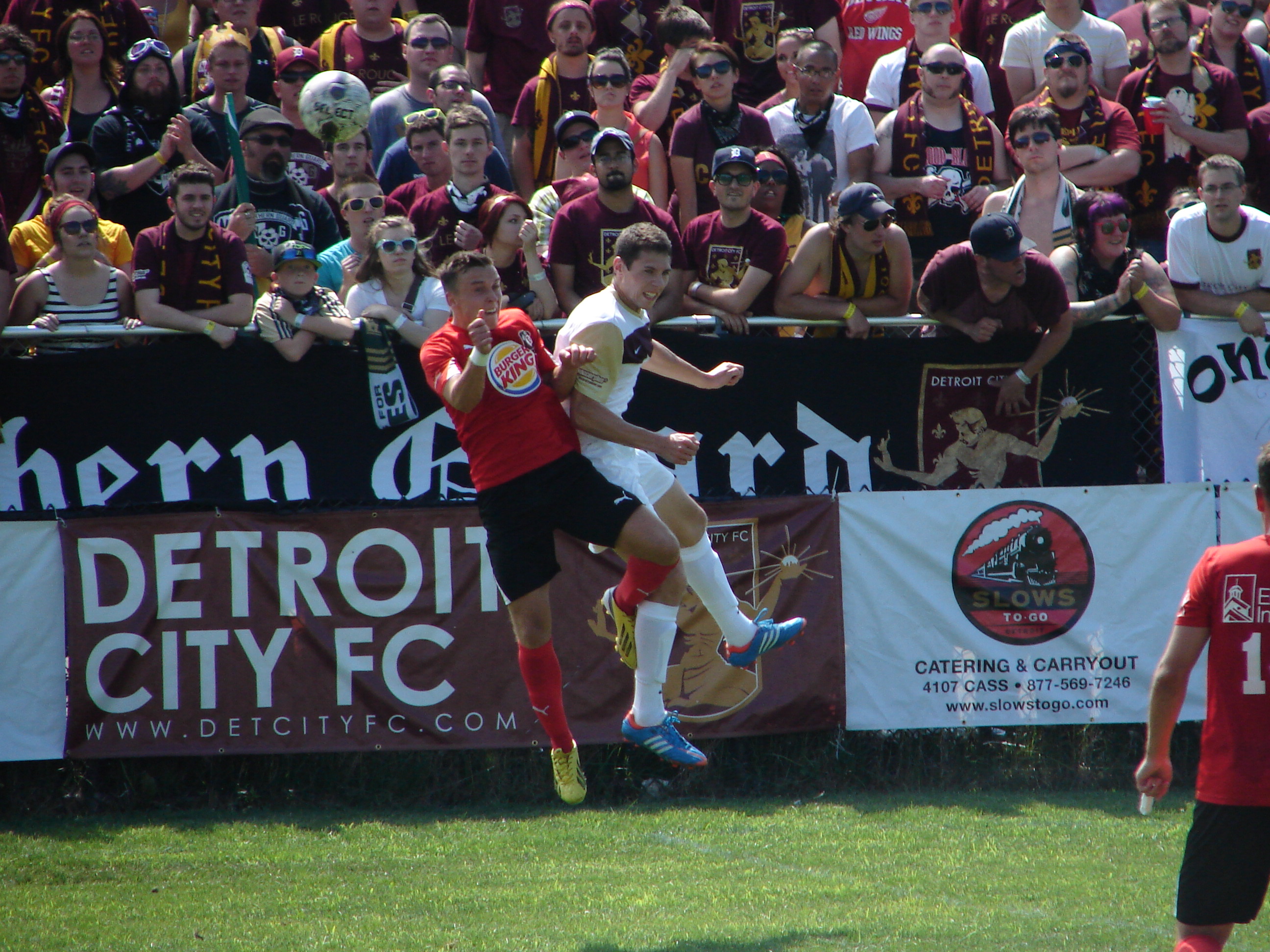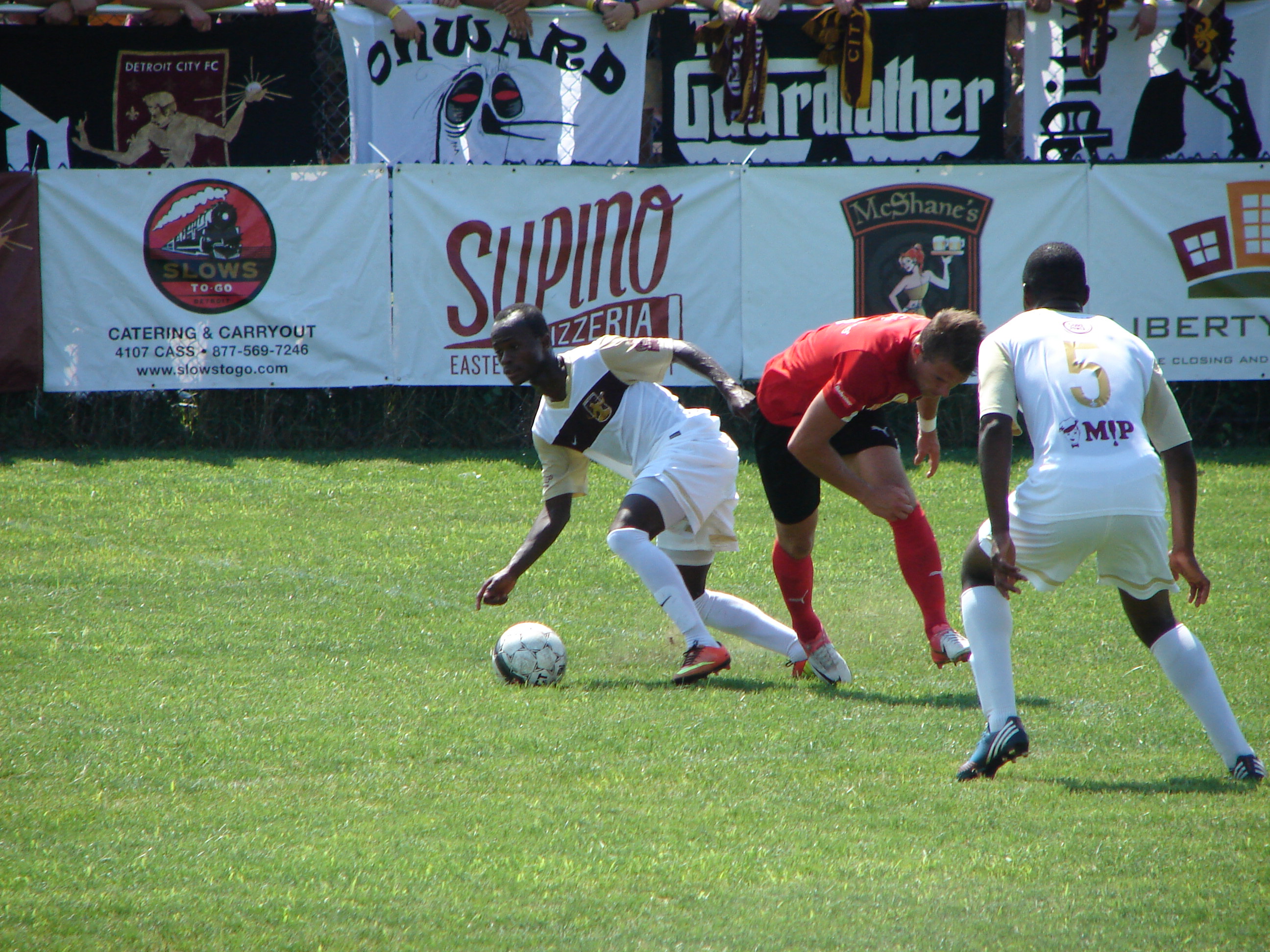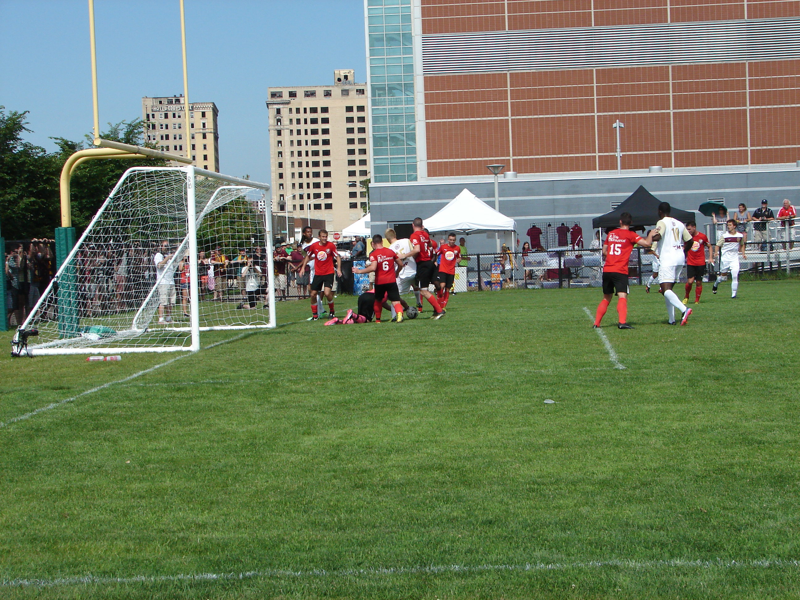 Second, I remember it was a scorching hot day. As the game progressed in the second half, and Le Rouge’s chances at victory diminished, the verbal taunts were getting nastier. During the second half I positioned myself along the fence on the Supporters’ side near the north goal that DCFC attacked. Within the final ten minutes, I heard a guy – one of many on that day – calling Erie keeper Dan Mudd some unflattering names. A police officer – I don’t recall if it was a DPS officer or a City of Detroit police officer – told the guy to knock it off. He took offense to being singled out of everyone in the area that was verbally abusing Mudd and the other Erie players. The cop began flexing his power by saying he could have him removed from the stadium and arrested. The fan persisted in questioning why him over everyone else. For a moment I thought I was going to have to pull my business card out and offer it to the kid in the event the officer followed through. Cooler heads prevailed.