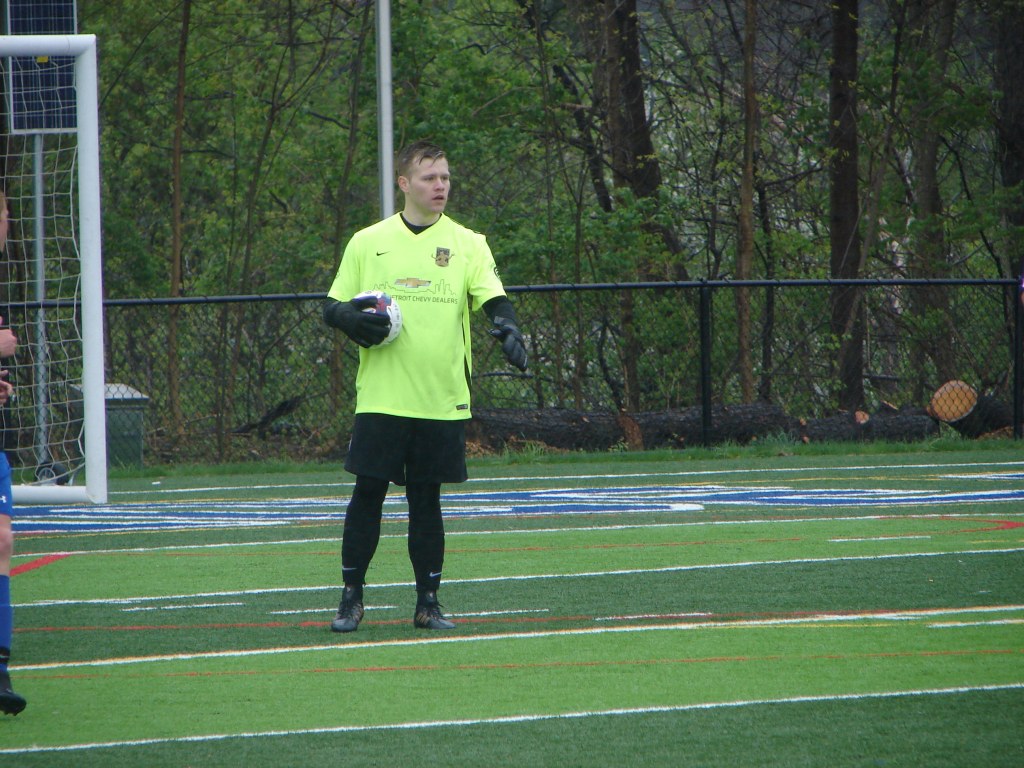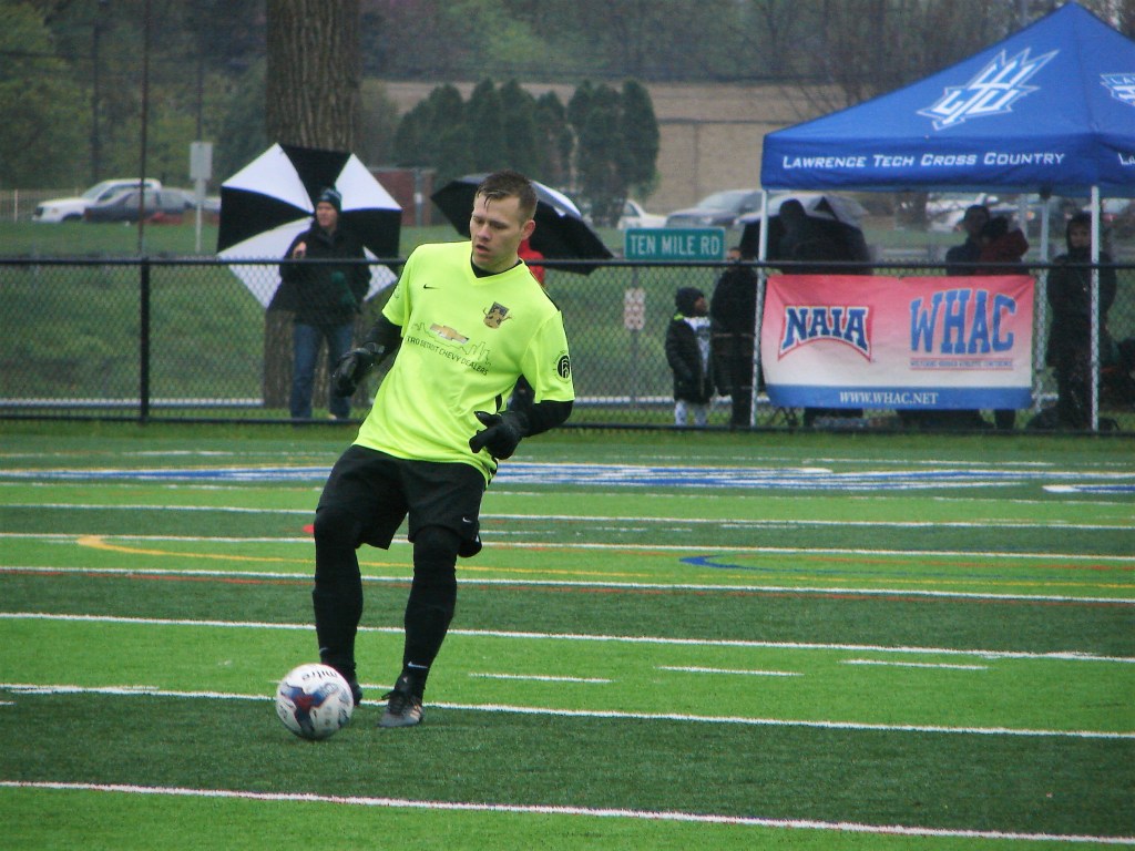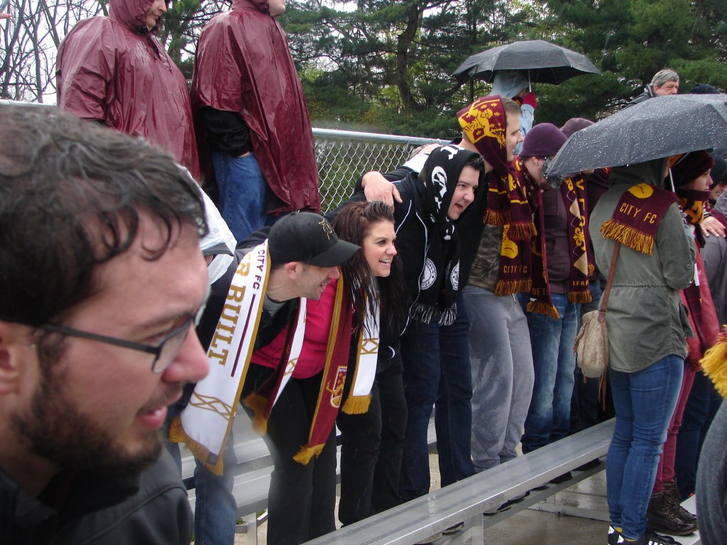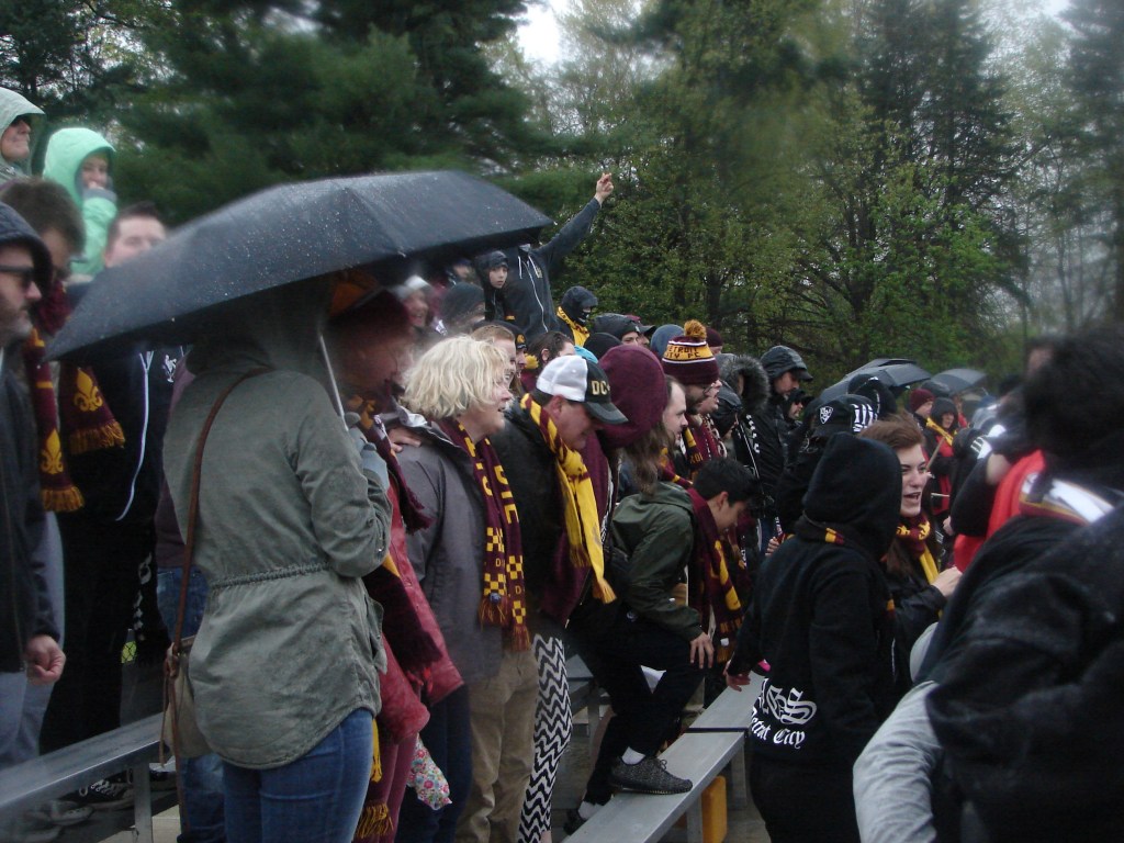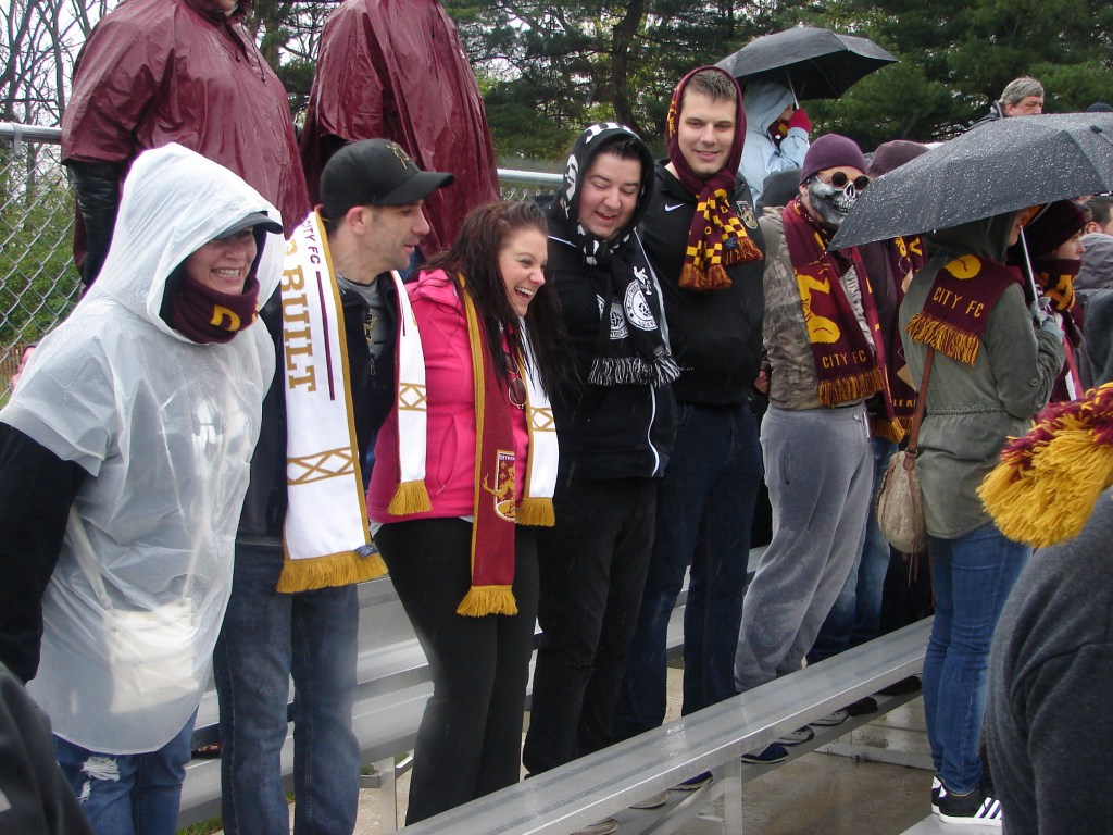 A radical change in temperature from our match two weeks ago in Saginaw. Cold, with a chilly rain. It didn’t dampen the spirits of those who turned out for another fun afternoon supporting the team. The Lawrence Tech Athletic Field held bleacher seating for about five-hundred, and we made ourselves at home.