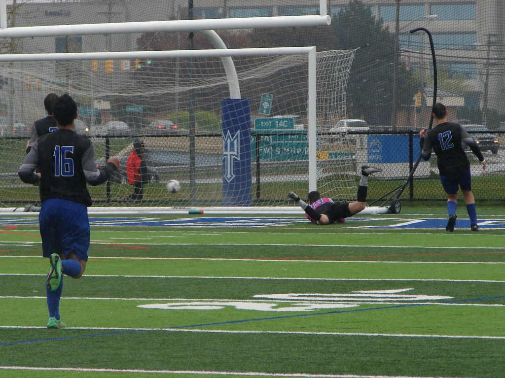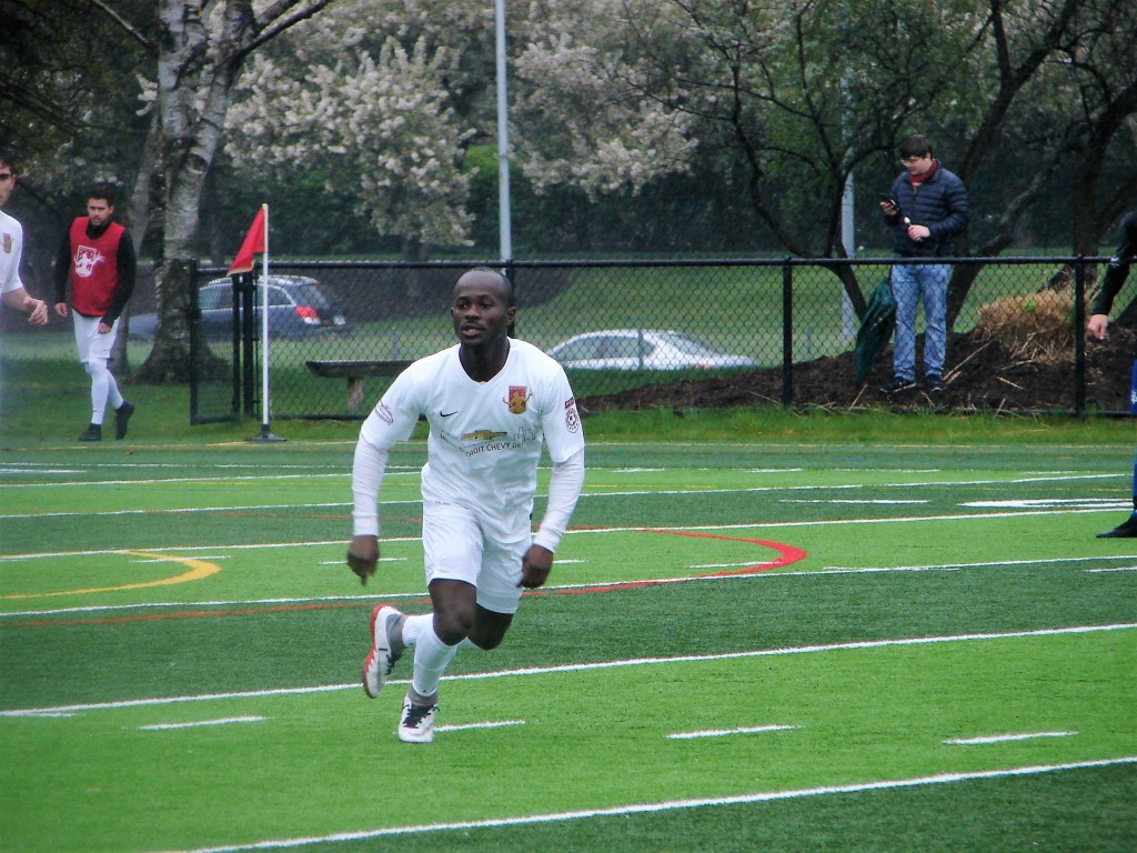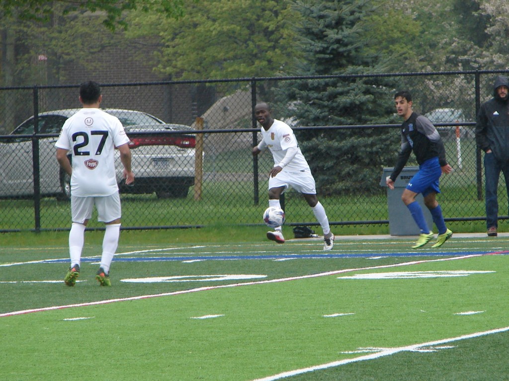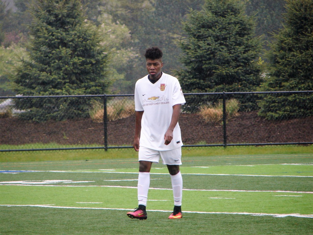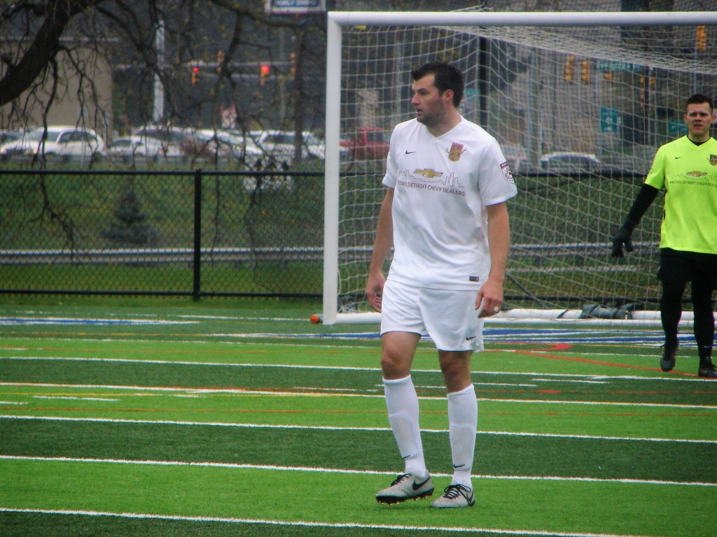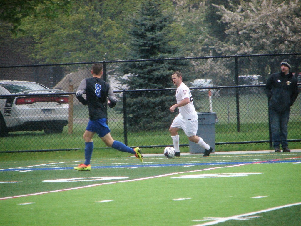 A radical change in temperature from our match two weeks ago in Saginaw. Cold, with a chilly rain. It didn’t dampen the spirits of those who turned out for another fun afternoon supporting the team. The Lawrence Tech Athletic Field held bleacher seating for about five-hundred, and we made ourselves at home.