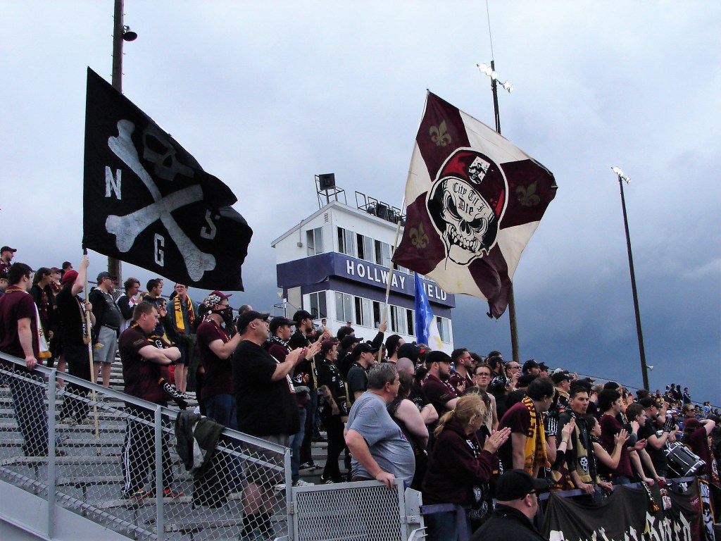 Our previous visit to Ann Arbor, our section was in the visitor’s bleachers of this high school football stadium. However, this afternoon, they guided us to the south end of the home side bleachers, reserving the visitor’s bleachers for the handful of Main Street Hooligans – the team’s supporters group. With that move came interesting results. Two security guards were stationed in front of the Northern Guard Supporters. Supporters were told to remove their face scarves – claiming them to be a terrorist threat. In exiting and passing by the Ann Arbor ‘Family Friendly’ fans, a conversation took place between a fan and a few NGS’ers about how he wanted his kid’s soccer experience to be (G-rated versus NGS-rated).