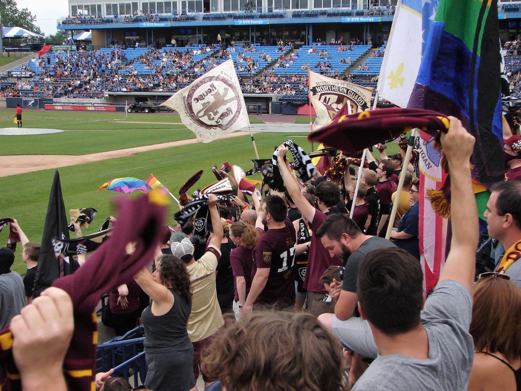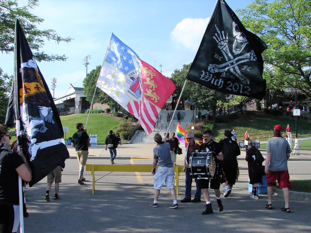 From the Unusual Pre-Game Incidents Department: The Rouge Rovers met at Vitale’s, a short distance from the ballpark. John Mozena tweeted that a busboy at the Comstock Park sports bar informed him that a family complained about “foul language” used by our supporters, singling out him, Tim Suliman, and me. What? I remember us conversing near the entrance, but “foul language?” I don’t think we were even talking about soccer. Perhaps they were offended by the outrageous number of supporters we had in their bar, and we were the closest to finger.