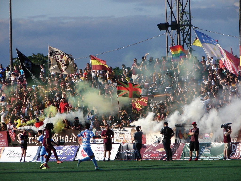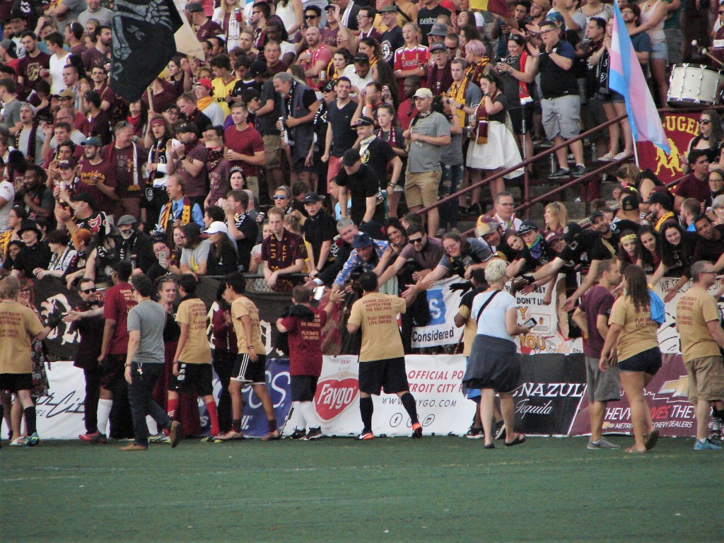 In the second half, shortly after the hour mark, Tyrone Mondi was sent in from a feathery pass from Jeff Adkins, but sent the ball wide, as City put on the pressure to tie the match. The play went back downfield, and James DeCosemo cut through the City defense and fired a shot into the corner, doubling Lansing’s lead in the 65th minute. Three minutes later, Tumi Moshobane outwitted the City defense, and fired a shot like DeCosemo’s, into the corner, giving Lansing a 3-0 lead. But did spirits wane? Nope. Because…
