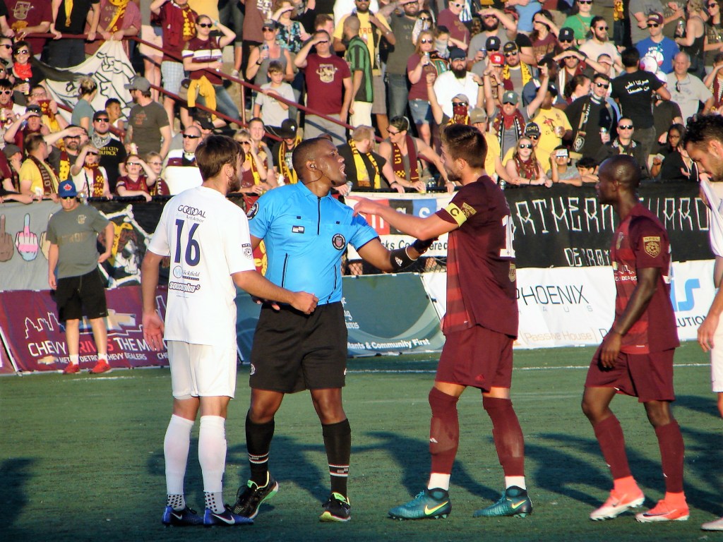 The soccer gods orchestrated a mythic conclusion to the match. We felt good with the 2-0 lead. Then Ann Arbor made some changes at the 54th minute, which included bringing Alec Lasinski and Kwessi Allen onto the pitch. Lasinski played for City last season, scored City’s first goal at Keyworth, and the game-winner for Ann Arbor in the suspended match at Keyworth. Kwessi Allen was the player who ran into me in that suspended match, causing me to hit the pitch and break my wrist.