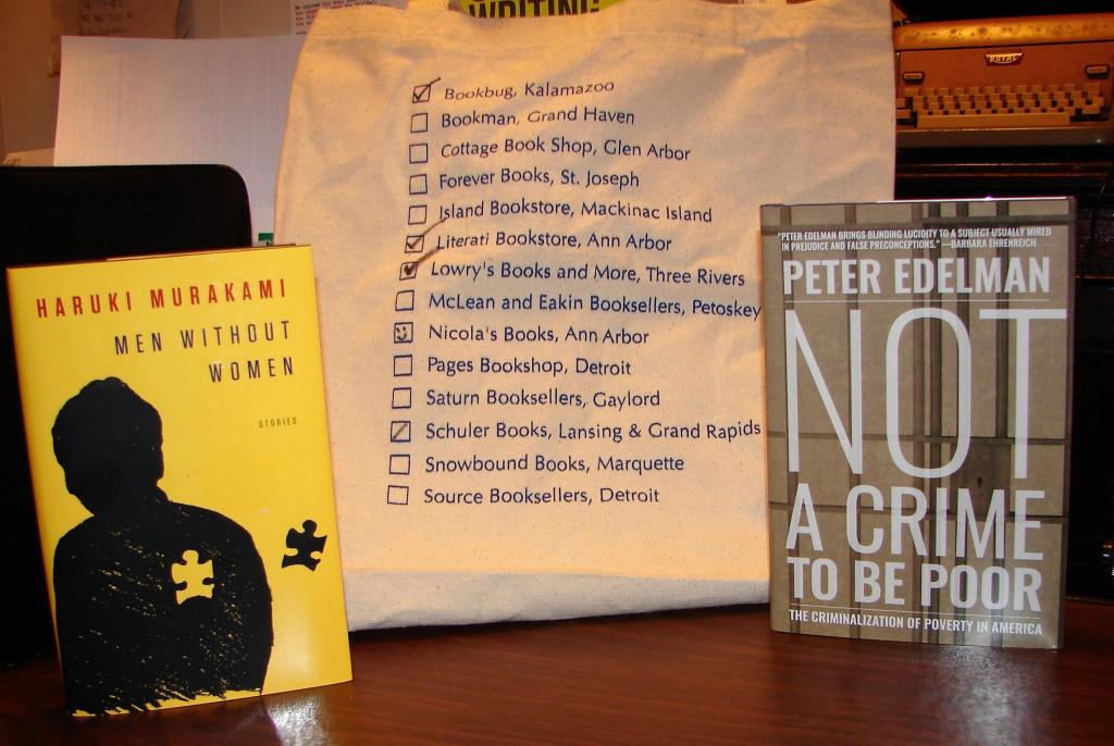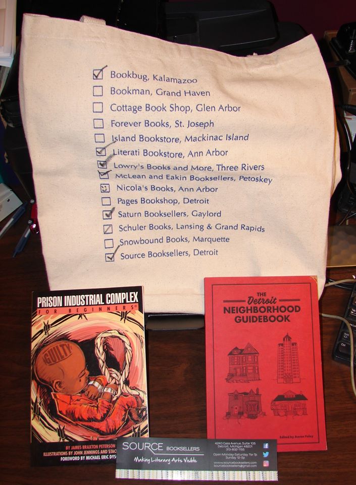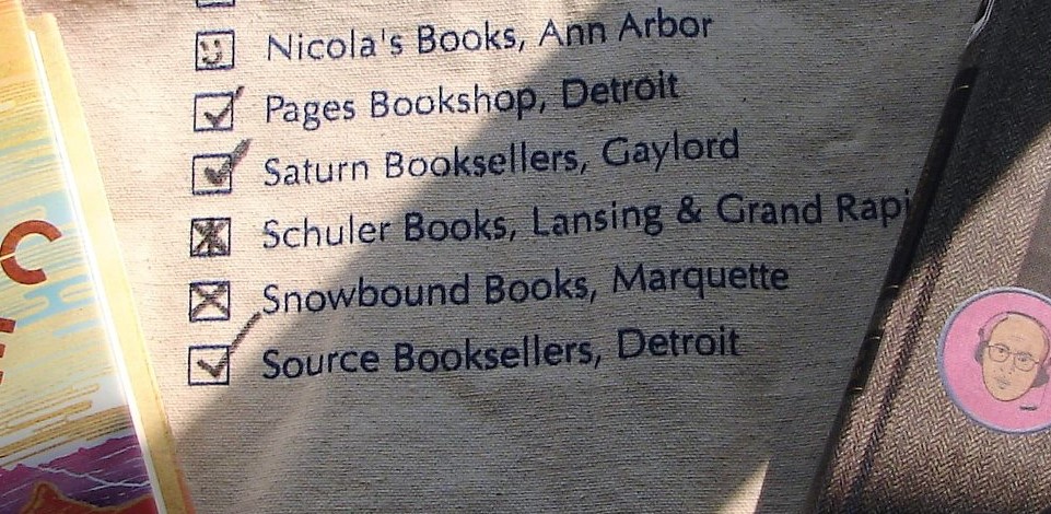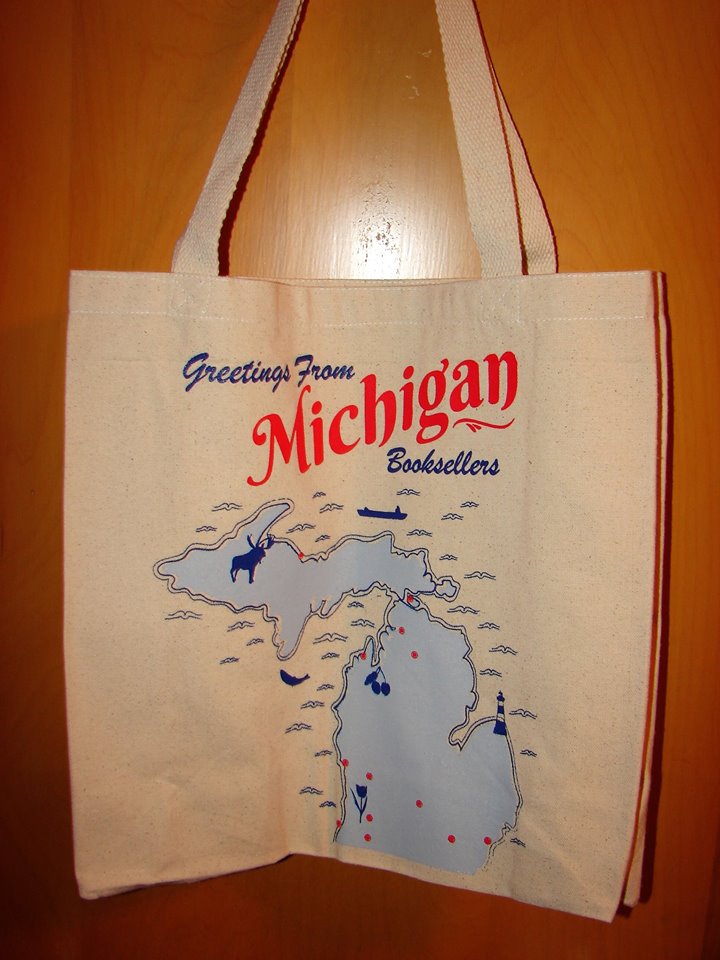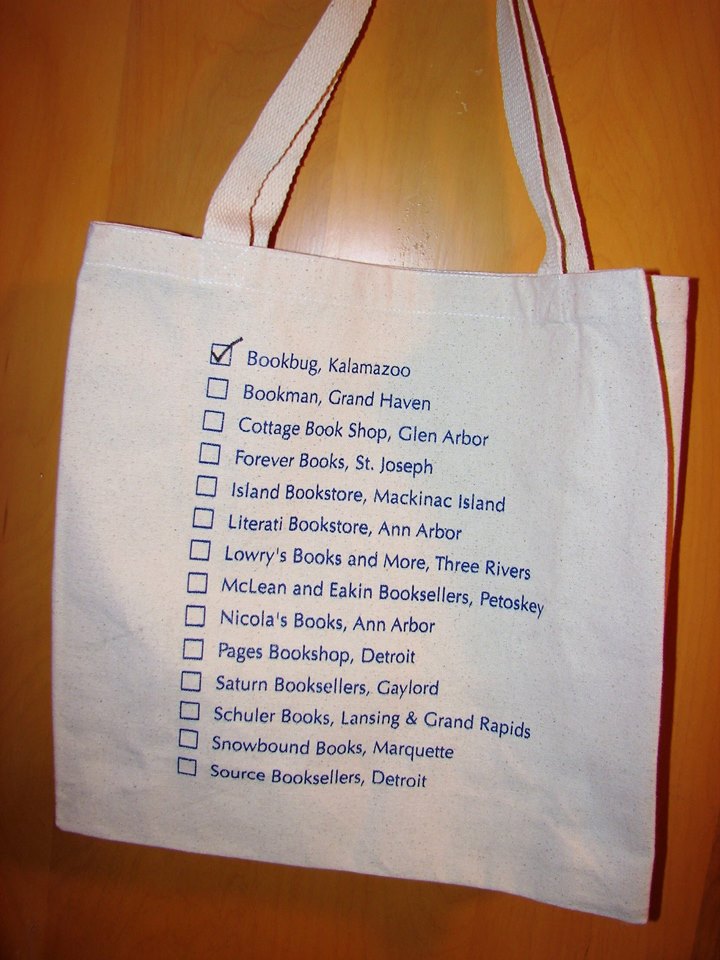 The “Greetings from Michigan Booksellers” tote displays a map of Michigan on one side, with dots identifying the location of the independent book stores listed on the back. Each store has a box next to it. All I needed to do was visit and make a purchase at a book store listed on the bag to receive a 10% discount and a check-mark in the box next to the store’s name.