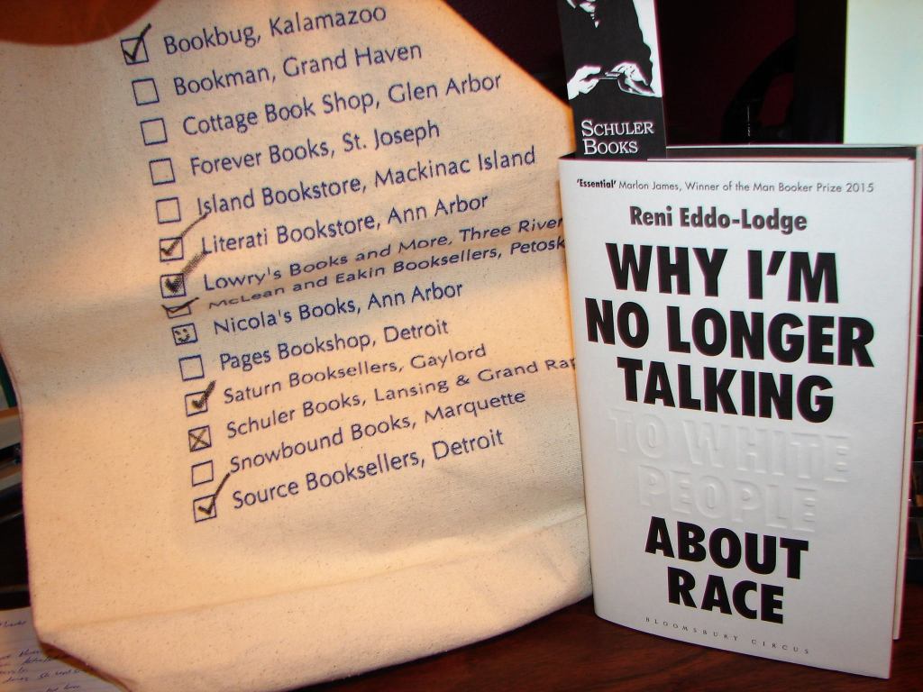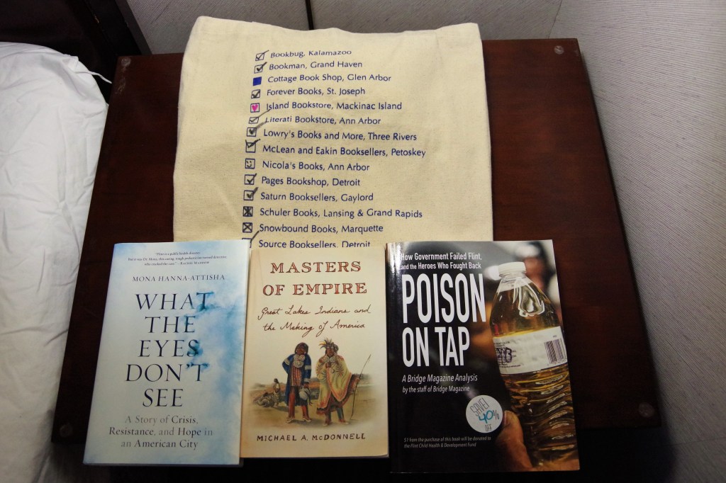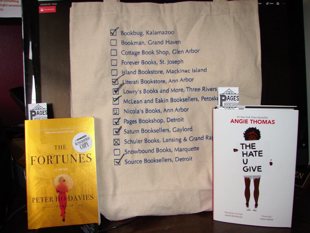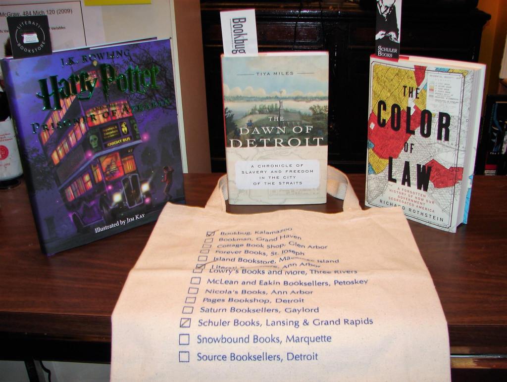 The “Greetings from Michigan Booksellers” tote displays a map of Michigan on one side, with dots identifying the location of the independent book stores listed on the back. Each store has a box next to it. All I needed to do was visit and make a purchase at a book store listed on the bag to receive a 10% discount and a check-mark in the box next to the store’s name.