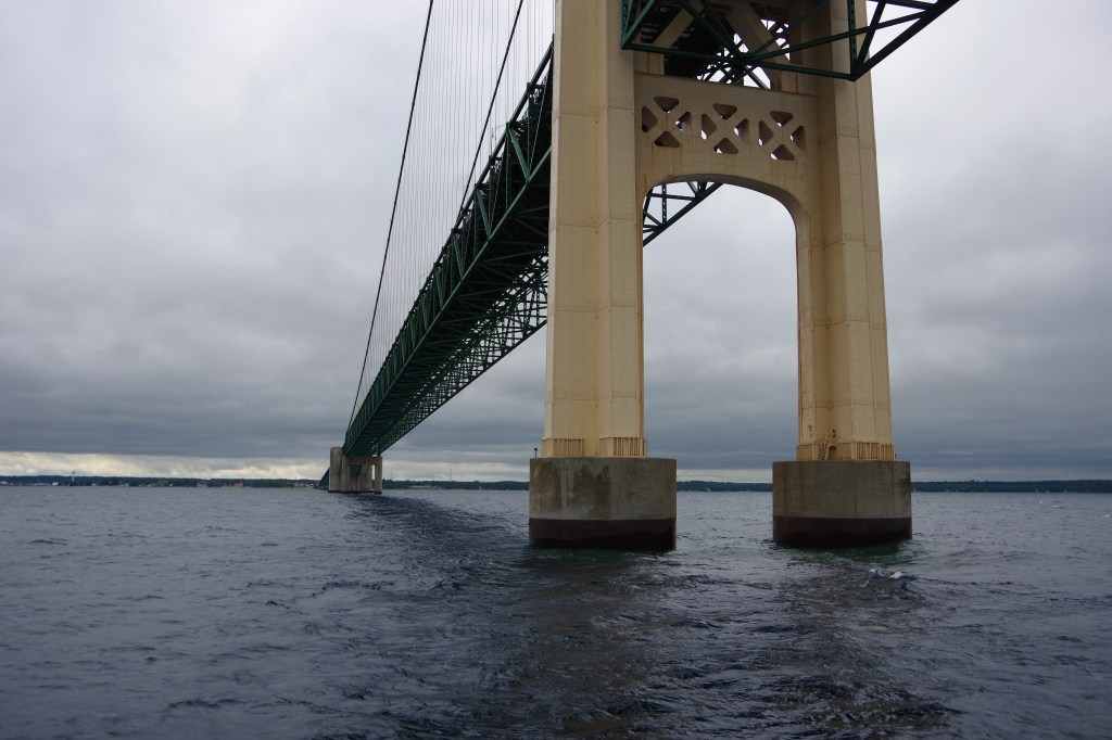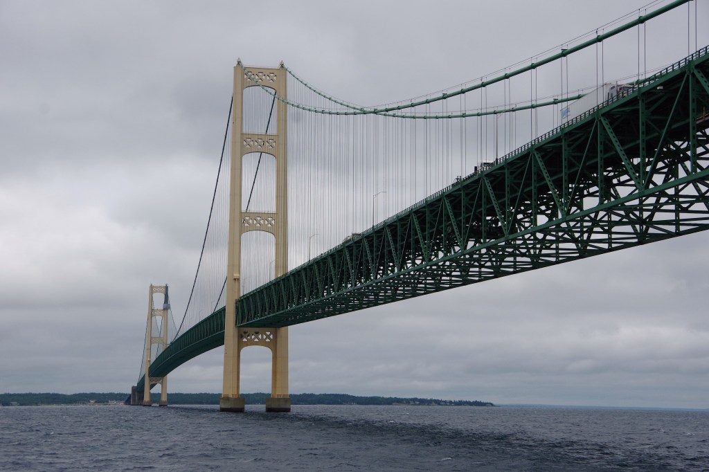 The Mackinac Bridge opened on November 1, 1957 to traffic between Michigan’s Upper and Lower Peninsulas. It spans 26,372 feet, separating Lake Michigan on its west and Lake Huron to its east.