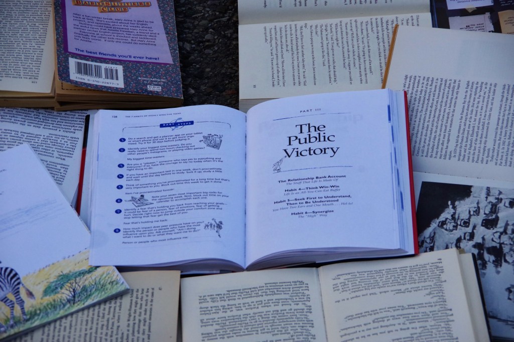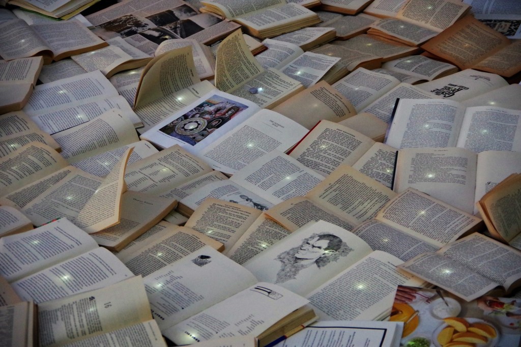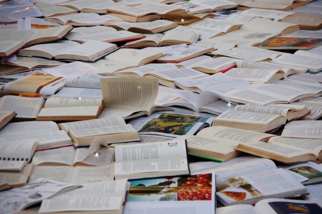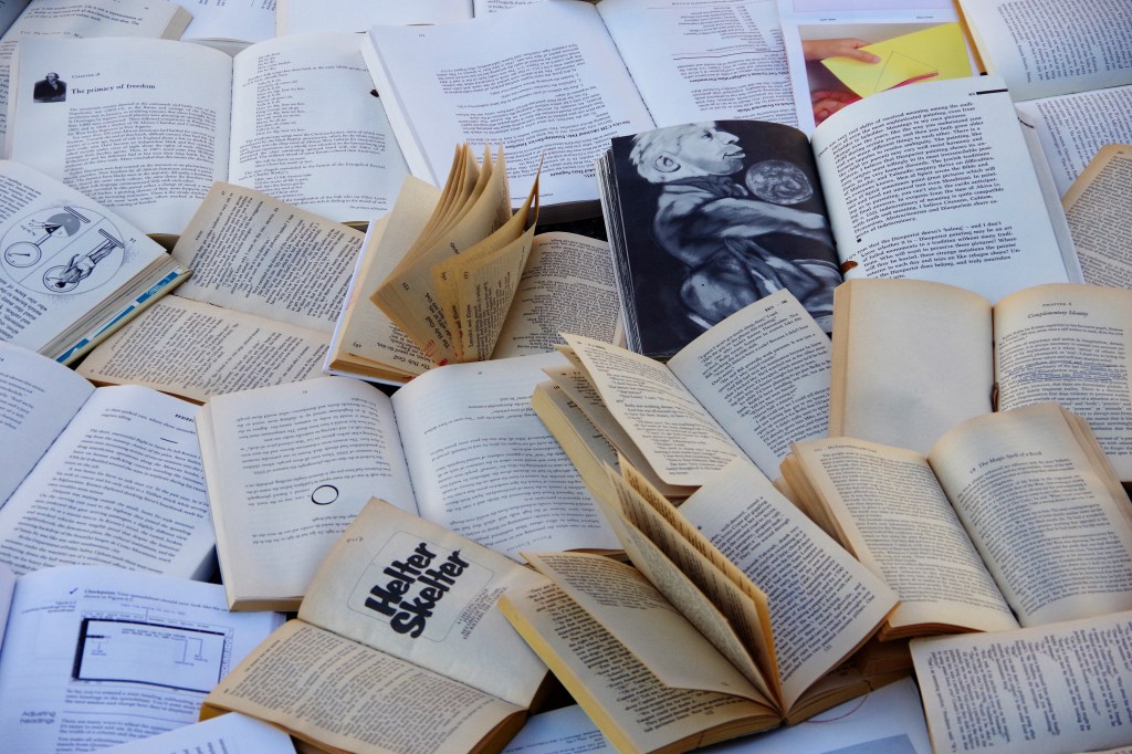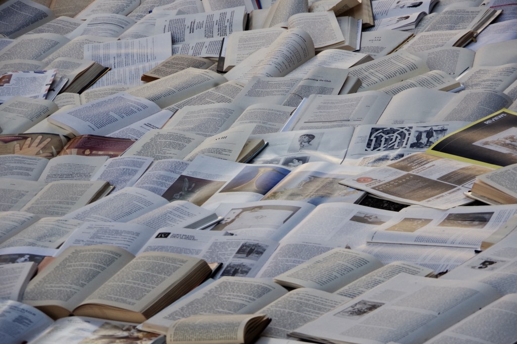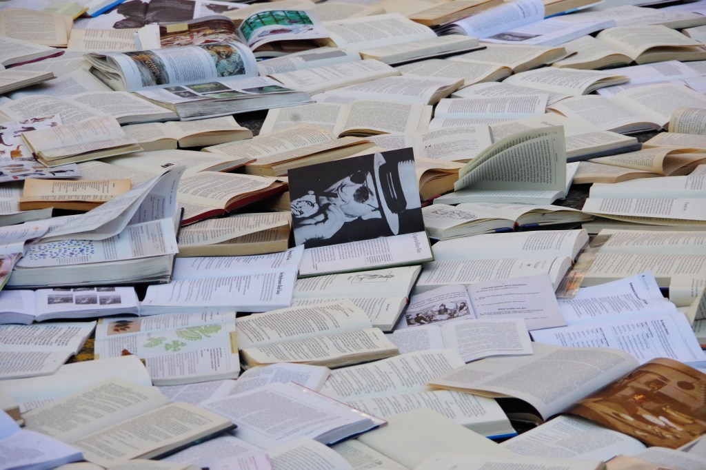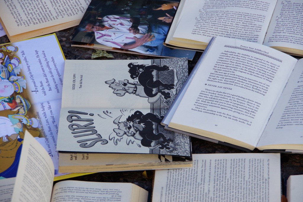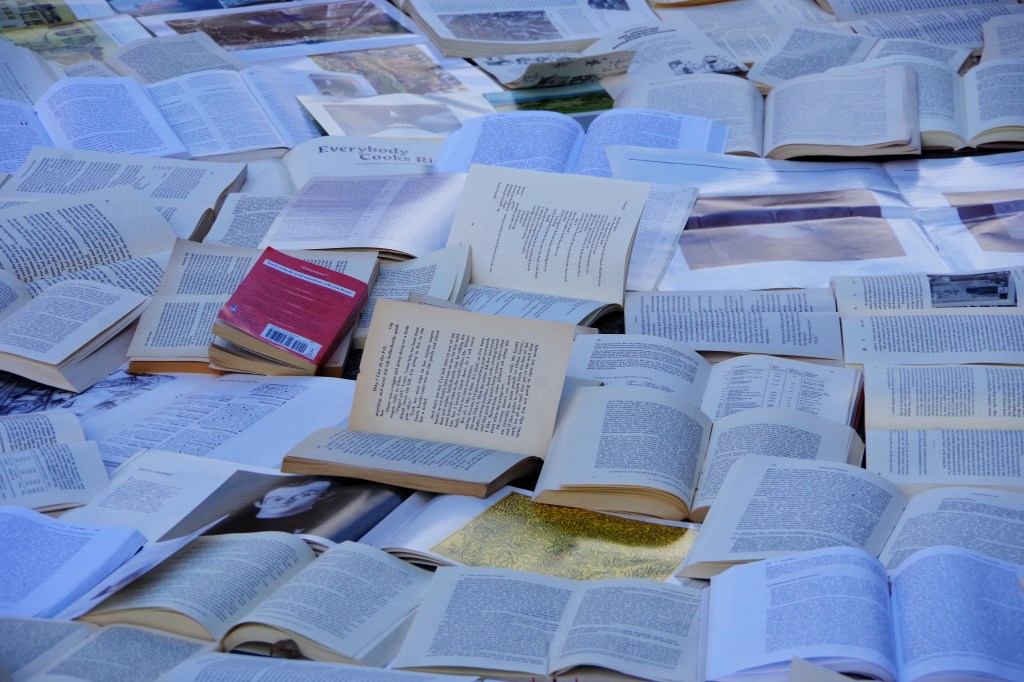 I arrived around four o’clock. I was a little disturbed, at first. It seemed like a blasphemous treatment of books. I walked around it, snapping photos of whatever caught my attention in the mass of pages.