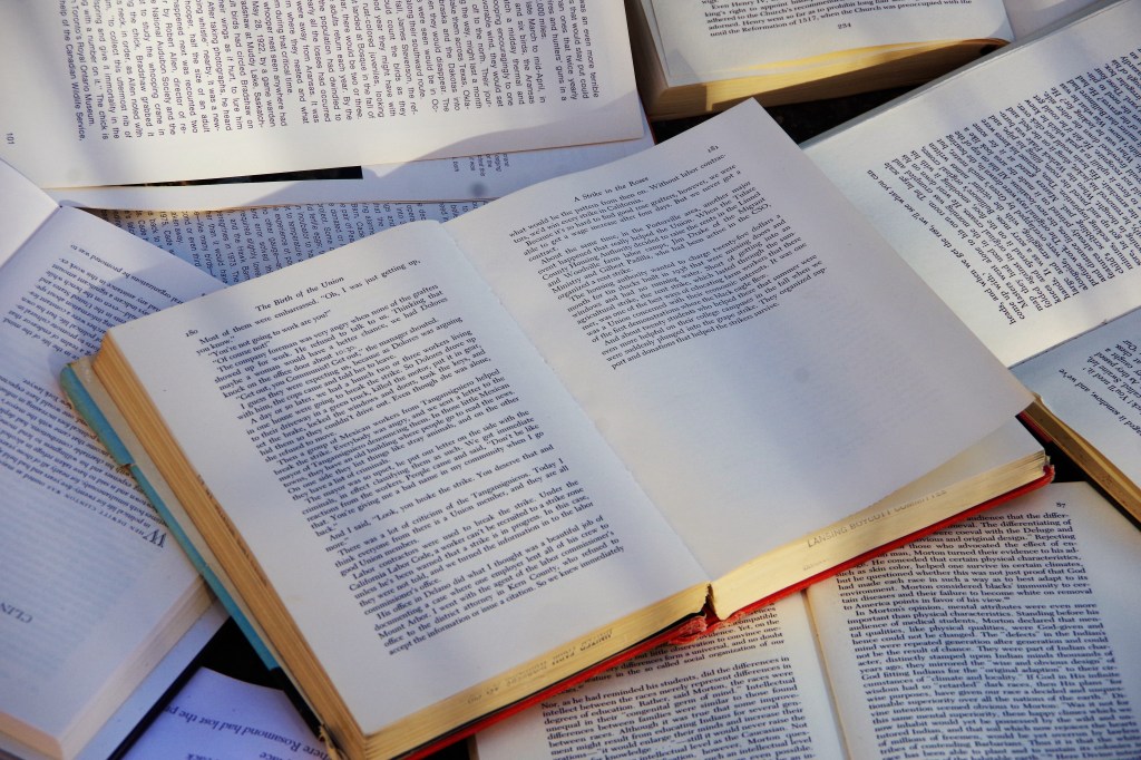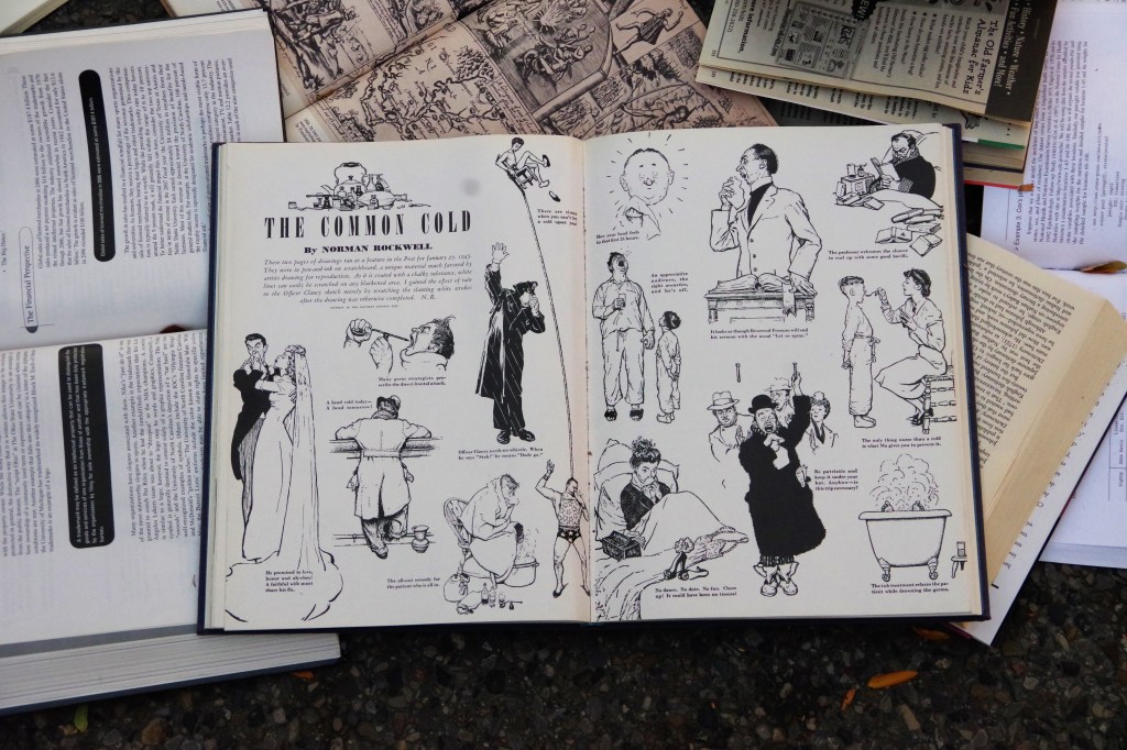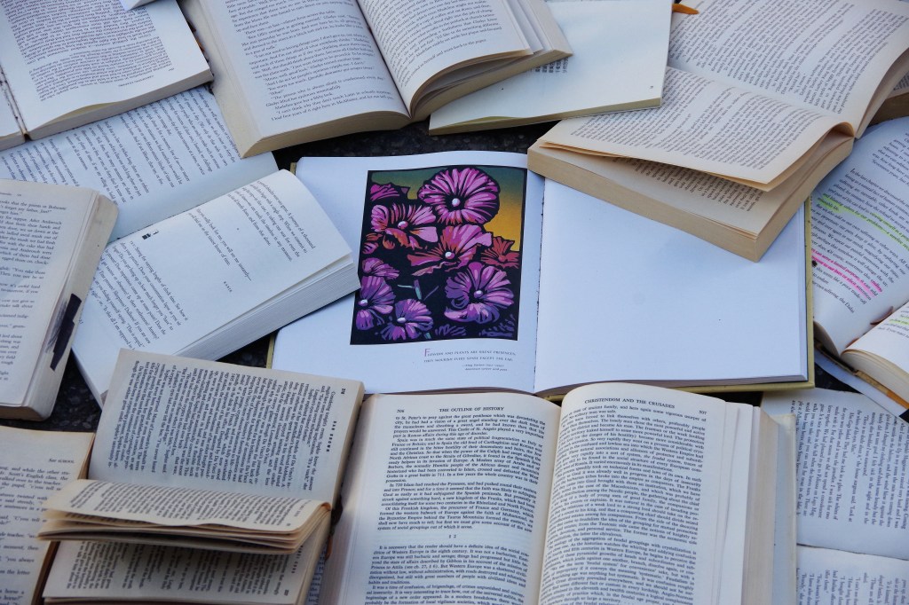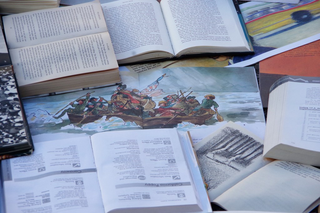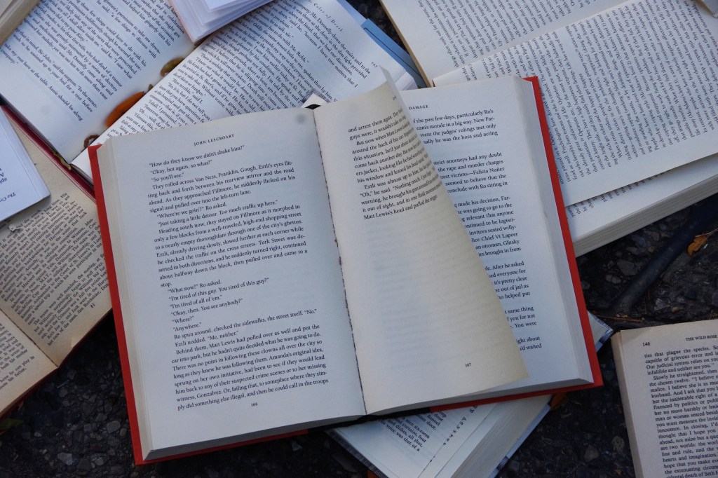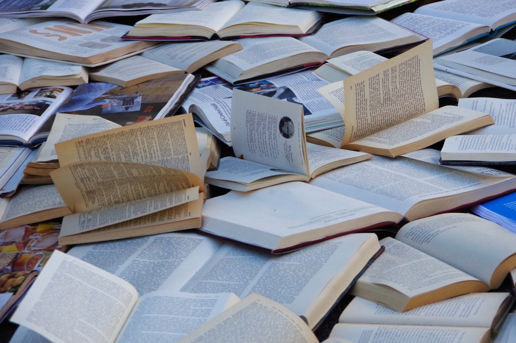 Standing there in the late afternoon, a breeze whipped down the street, fluttering the pages. A ripple of waves on a paper sea, whispering the words and ideas of their authors.