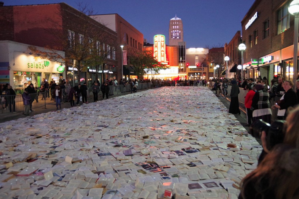 I did not stay when the book-taking began. However, as I prepared to leave, I noticed something that I needed to capture. In the background of this pond of pages is the building that once held the flagship location of Borders Book Store.