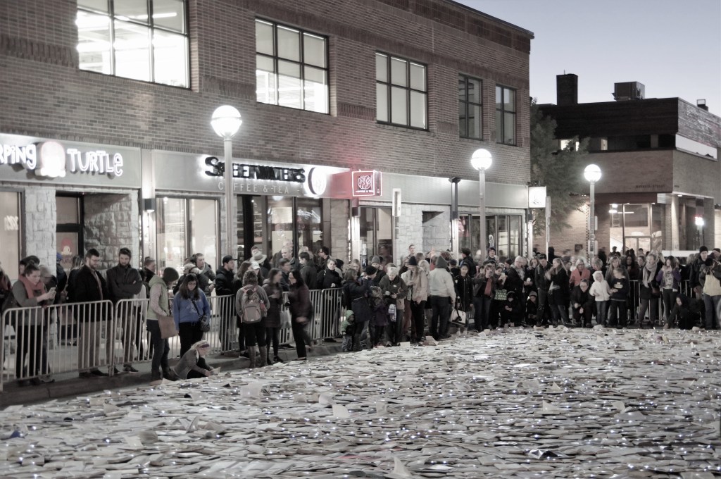 The installation held a contemplative atmosphere. I thought about how libraries and book stores shelve books together by category, for convenience, yet in the street, the lines are blurred and intertwined. A mystery novel could lay next to a math text book; a contemporary social science study next to a nautical history from a century ago. Beacons of community. At night’s end, all will have found a home.