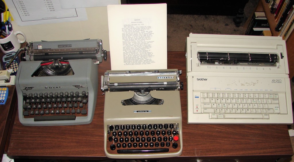 Next was the hard part – typing it out.  It has been a long time since I’ve had to type something requiring such precision.  No spell correction.  No simple backspace and retype.  After typing the first page partially through four times (pulling it from the machine after stupid mistakes), I realized what a task I set for myself.  Not only to type the story, but to do so using three different typewriters, which is what the story called for.  I had to set the margins to meet the needs of the publication, for each machine.  Then, there were the pages where a section on one typewriter ended and a new section on one of the other typewriters began.  The challenge of lining them up and not making an error in the second part, so I didn’t have to go back and type the first part on the first typewriter again, didn’t make my  life easy.