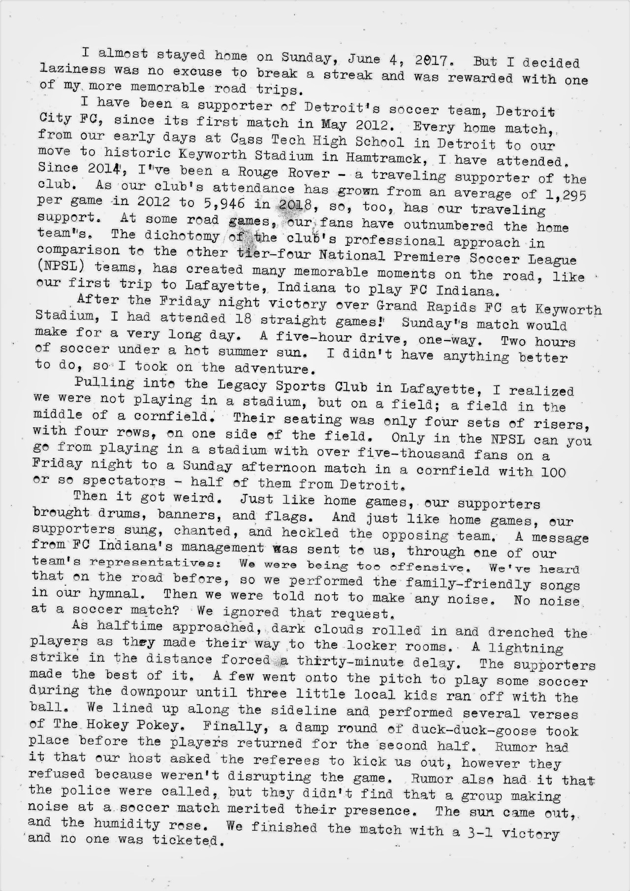 Typing Assignment #22 is to write about a summer road trip. I thought I was going to miss this assignment. Partially because of life’s general busyness, and mostly because I couldn’t locate a trip worthy of writing about. There have been many family road trips – both as a kid and as a parent – but I didn’t think any of them would be interesting to a casual reader. Then, as the playoffs for Detroit City FC approached and I was preparing for a potential away match, I realized that I had some wild experiences on Detroit City FC road trips.