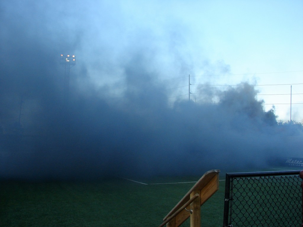 Despite the empty supporters’ section, the Northern Guard’s Smokey the Bot, a smoke-deploying robot, provided the post-goal, celebratory smoke.