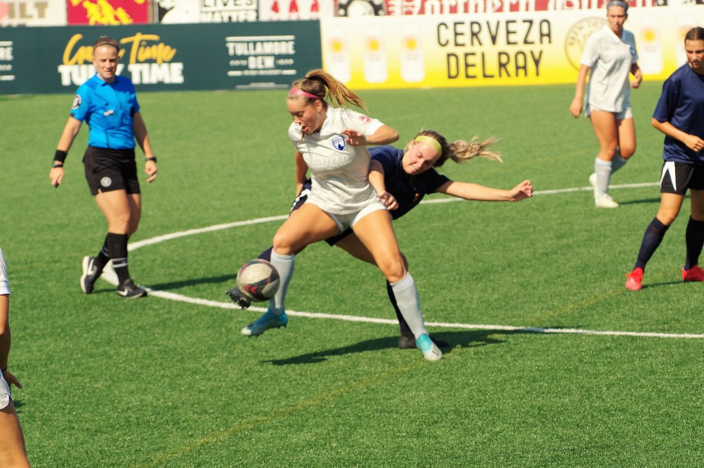 Rachel Philpott equalized in the 53rd minute for Lansing United. But in the 83rd minute, Syd Blomquist forced a turnover by the Lansing keeper, allowing Kenna White to notch the game-winner. Smokey the Bot celebrates.