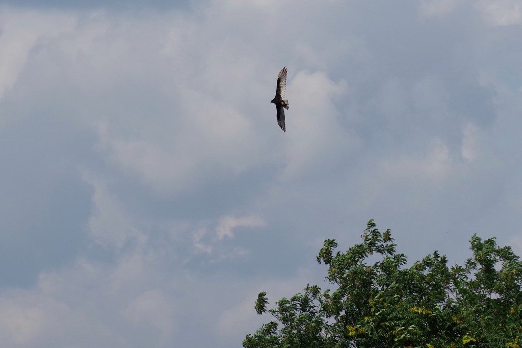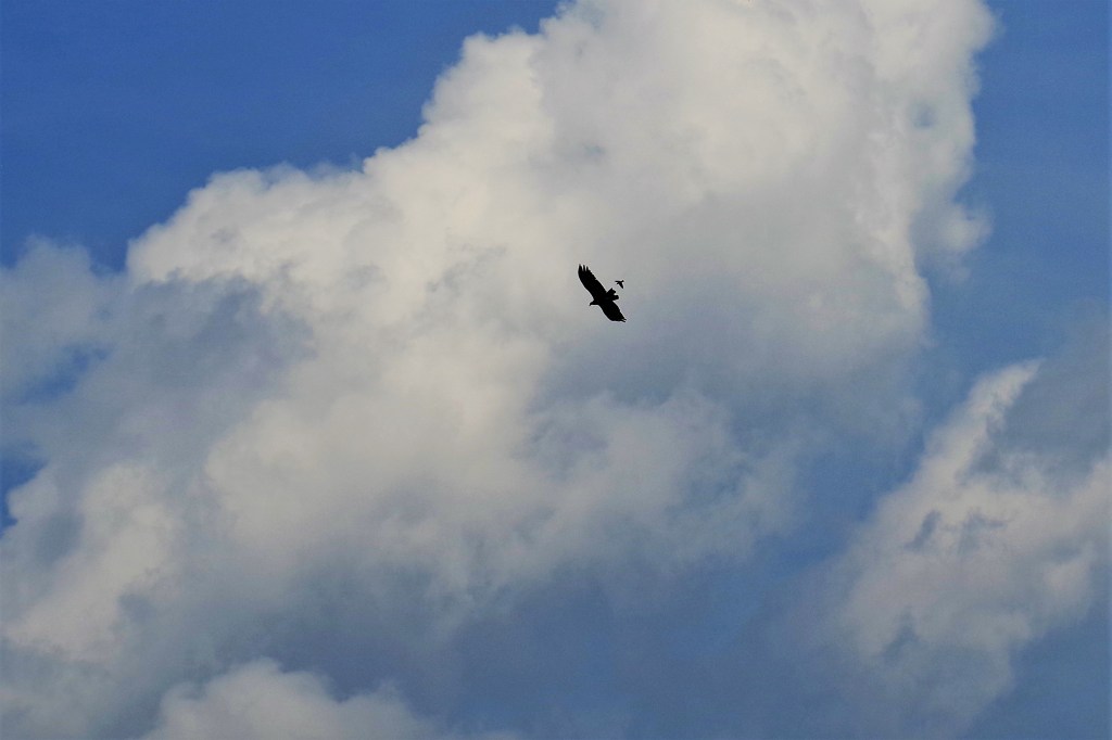 Above the pitch, a large bird hovered and soared with a much smaller bird in pursuit.