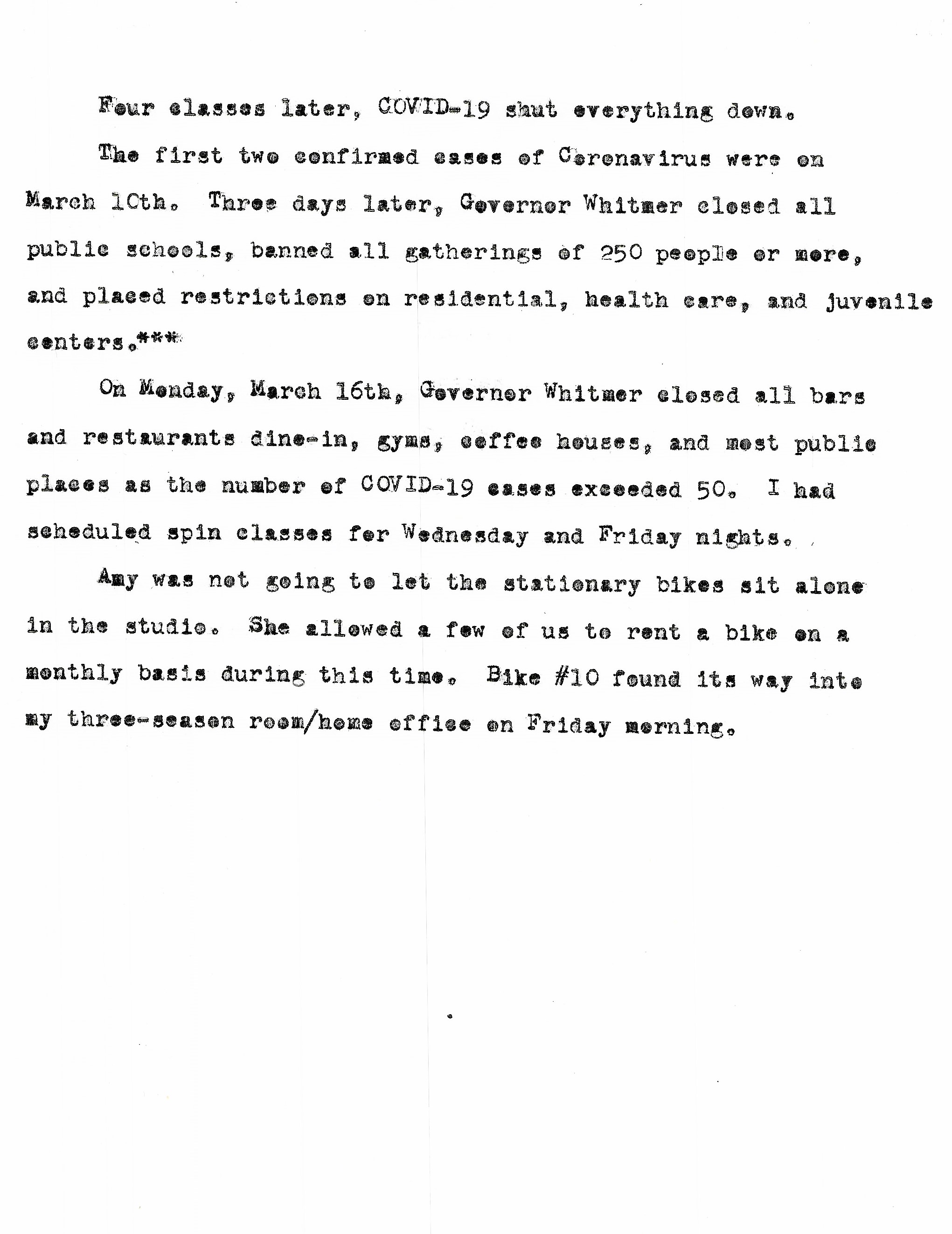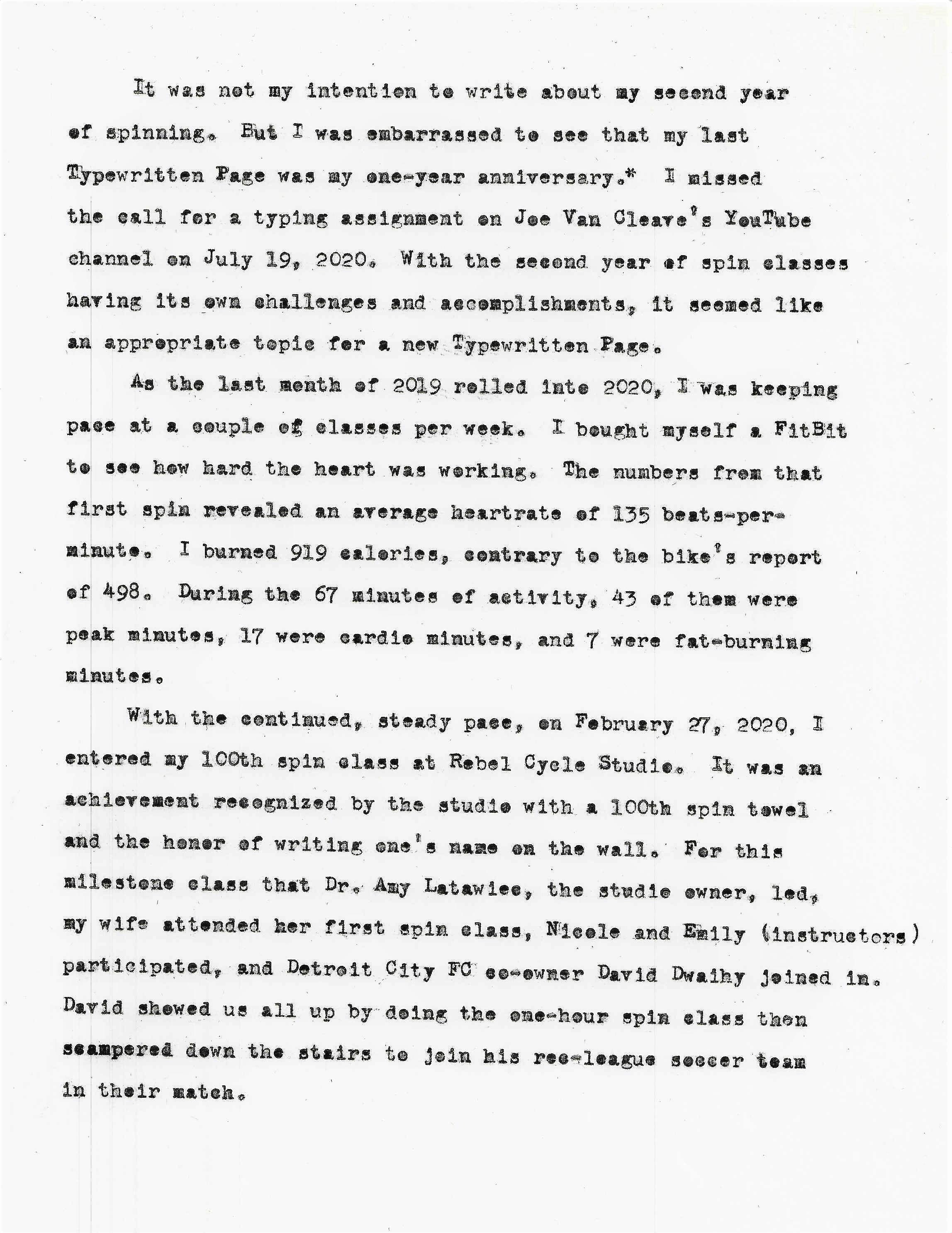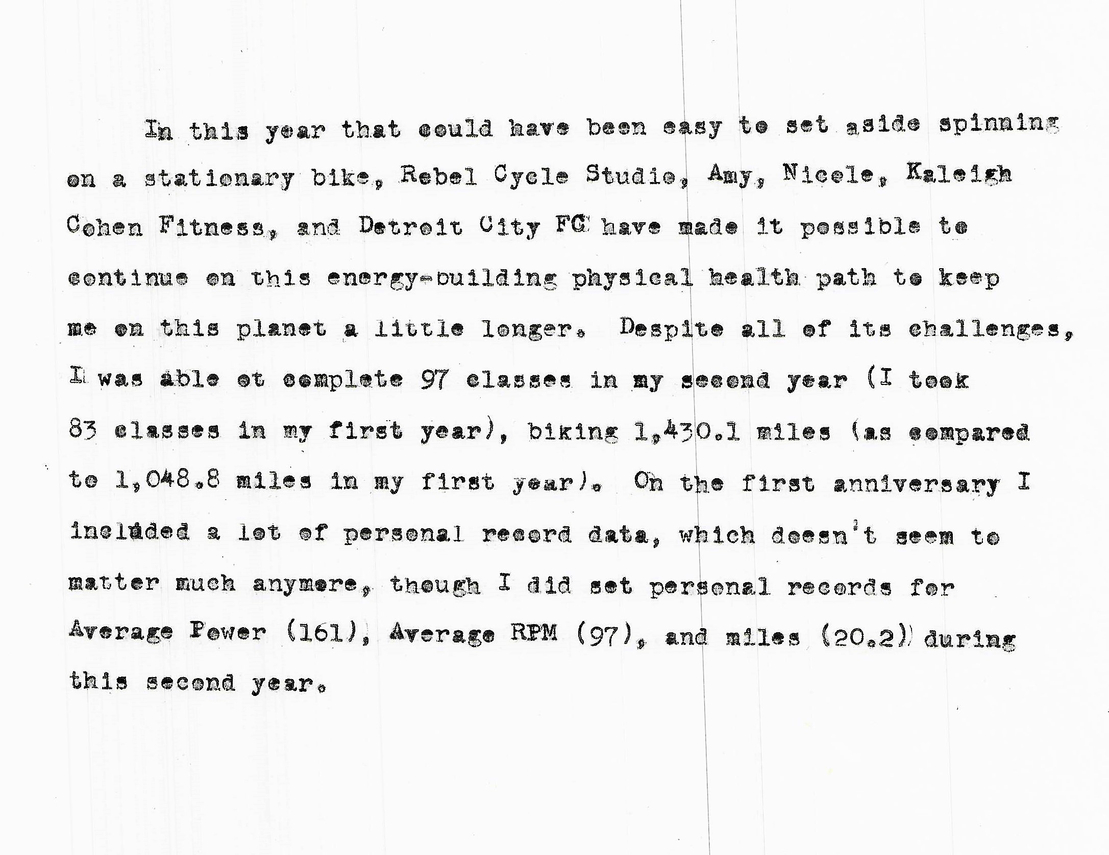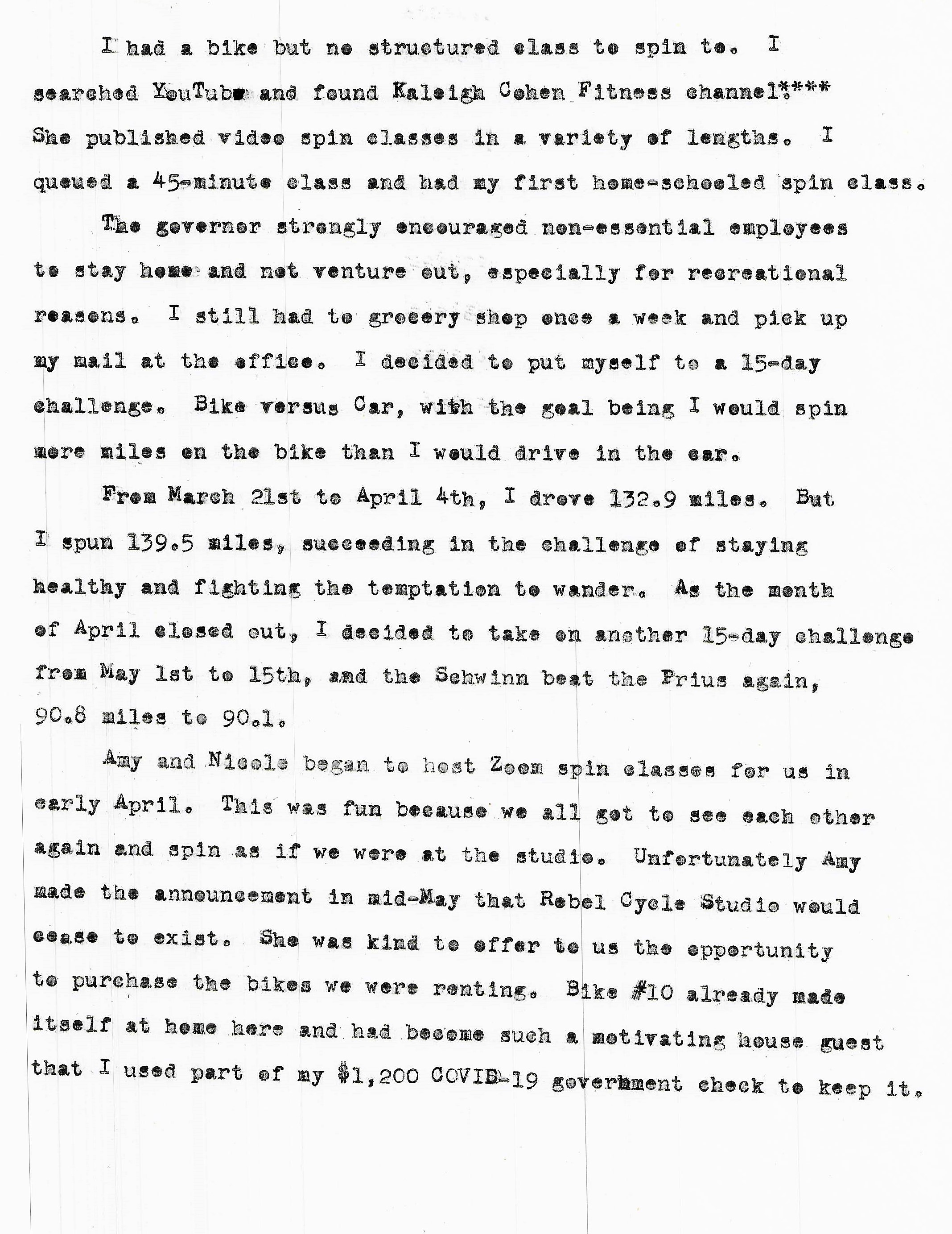 November 28, 2020: A Second Year of Indoor Cycling dohaeng 2 comments November 28, 2020 *Spinning around the sun: my first year of indoor cycling.** Joe Van Cleave’s YouTube channel. *** Michigan Coronavirus Timeline – ClickOnDetroit. **** Kaleigh Cohen Fitness. OTHER TYPEWRITTEN PAGES Share this: Click to email a link to a friend (Opens in new window) Email Click to print (Opens in new window) Print Click to share on Facebook (Opens in new window) Facebook Click to share on X (Opens in new window) X Click to share on Reddit (Opens in new window) Reddit Click to share on Pinterest (Opens in new window) Pinterest Like Loading... Related